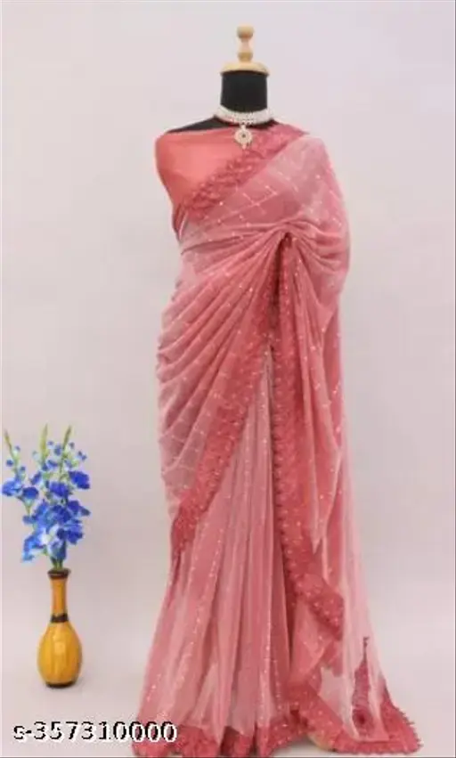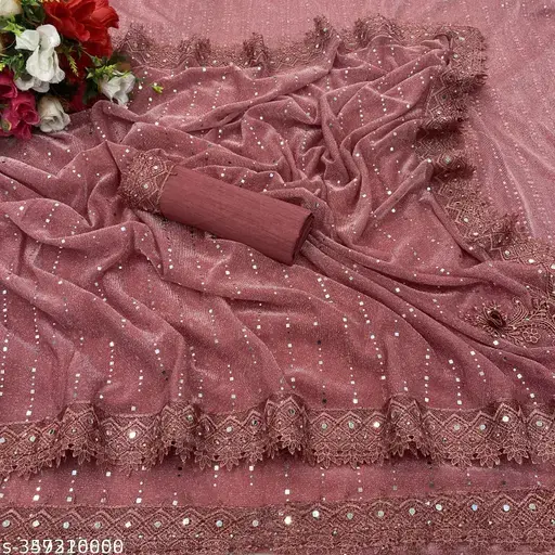 Shine bright at every celebration with this Shimmer Saree, designed for women who love glamour and sophistication. Made from imported Lycra blend shimmer fabric, the saree features intricate mirror tikli work and embroidered chemical (Schiffli) lace, creating a stunning, eye-catching look. Paired with a Banglori Dupion Silk unstitched blouse, you can tailor it to your perfect fit. Ideal for parties, weddings, festive occasions, and special events, this saree ensures you make a dazzling statement wherever you go.