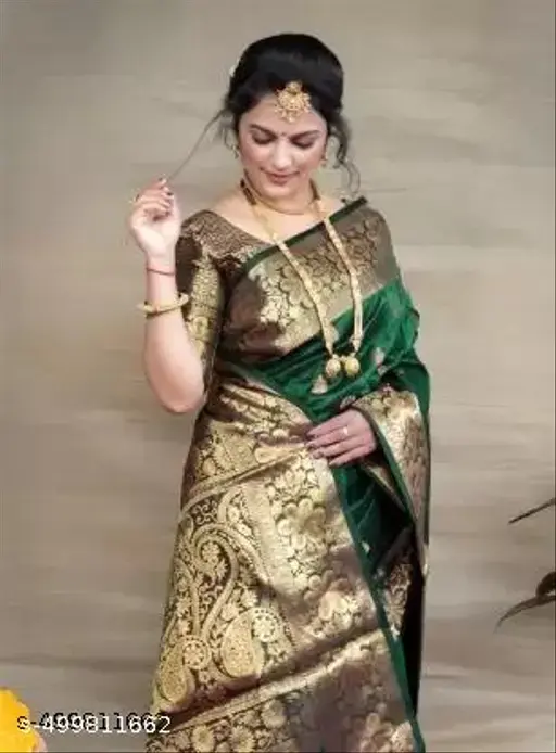 The rich green hue, inspired by classic Kanjeevaram styling, enhances its regal appeal, making it an ideal choice for weddings, festive celebrations, and traditional occasions. The saree comes with a matching Banarasi silk running blouse, featuring a border-coordinated pattern that completes the ensemble beautifully.