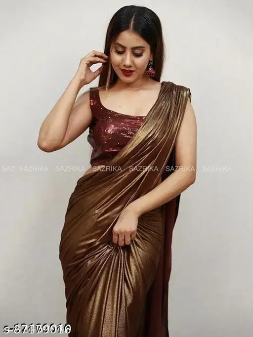 Elevate your ethnic wardrobe with this Coffee Lycra Blend Saree, perfect for women who love Bollywood-inspired elegance with modern comfort. Crafted from soft, stretchy Lycra, this saree drapes beautifully and is comfortable for all-day wear. The saree features a solid coffee color that pairs perfectly with the embellished Dupion Silk running blouse, creating a chic and stylish look for parties, casual outings, and festive occasions.